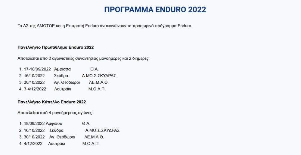 Διαφορα AMOTOE ΠΡΟΓΡΑΜΜΑ ΠΑΝ. ΠΡΩΤΑΘΛΗΜΑΤΟΣ ΚΑΙ ΚΥΠΕΛΛΟΥ ENDURO 2022 Δημοσιεύτηκε από endmxadmin 5 Μαρτίου, 2026 Ενεργό 8 Απριλίου, 2022 0 Ανακοινώθηκε από την ΑΜΟΤΟΕ το ΠΡΟΣΩΡΙΝΟ πρόγραμμα αγώνων enduro για το 2022.